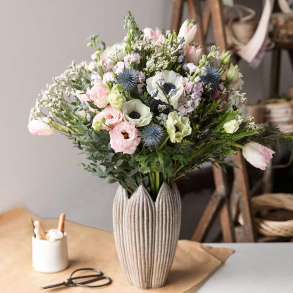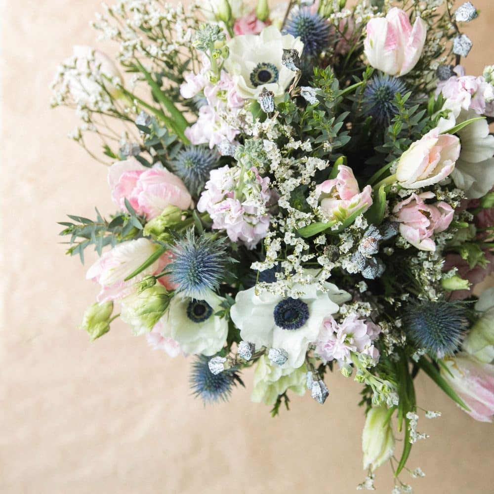Dans des tons de blanc, de bleu pâle et de vert doux, ce bouquet est le choix parfait pour apporter une touche de fraîcheur à votre intérieur ou pour offrir à vos proches. Composé par Estel Fleurs avec soin et créativité, ce bouquet est disponible en différentes tailles et peut être livré à Carcassonne et dans les environs. Veuillez noter que les fleurs utilisées peuvent varier en fonction de l’arrivage et de la disponibilité saisonnière.