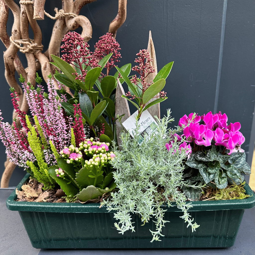 Présentée dans une jardinière de 40 cm, cette composition regroupe des plantes de saison résistantes aux conditions extérieures. Parfaite pour honorer vos proches lors de la Toussaint, cette jardinière assure une belle et durable présence florale.